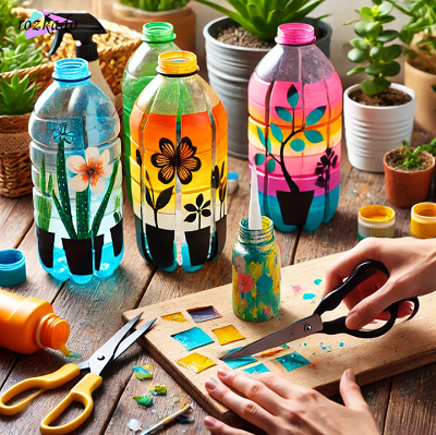 بطری‌های پلاستیکی را به شکل دلخواه برش دهید و با رنگ‌های اکریلیک یا اسپری رنگ‌آمیزی کنید. سپس از آن‌ها برای کاشت گل‌های کوچک یا گیاهان آپارتمانی استفاده کنید.