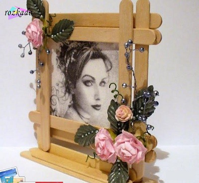 چوب‌های بستنی را شسته و خشک کنید. سپس با چسب به شکل قاب عکس کنار هم قرار دهید. برای تزئین، می‌توانید از رنگ، روبان یا دکمه‌های قدیمی استفاده کنید.