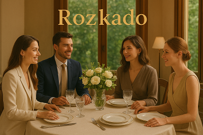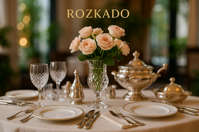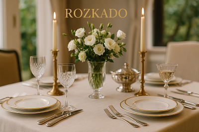 یک میز رسمی میتواند شامل بشقاب چینی سفید با حاشیه طلایی، قاشق و چنگال نقرهای براق و لیوانهای کریستالی پایهدار باشد.
